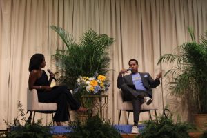 Host, Darby Smith and special guest, Lodric Collins having an insightful conversation in the Smith Brown Memorial Student Union Ballroom.