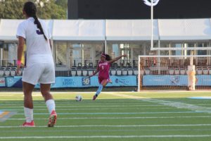 Graduate student defense Alyssa Romero takes a free kick during senior night vs Alcorn State University at A.W. Mumford Stadium on October 17, 2025.