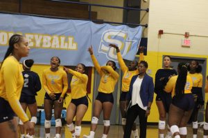 The Lady Jaguars cheer on their teammates as they took on the Texas Southern Tigers in Seymour Gym on September 29.